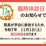 - 11月の休診のお知らせ11月の休診のお知らせです。 大変ご迷惑をおかけしますが、ご理解のほどお願いいたします。