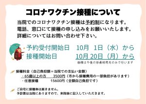 コロナワクチンに関してのお知らせです。 当院ではコロナワクチンは、予約制になります。 インフルエンザワクチンは、当日接種としております。よろしくお願いします。